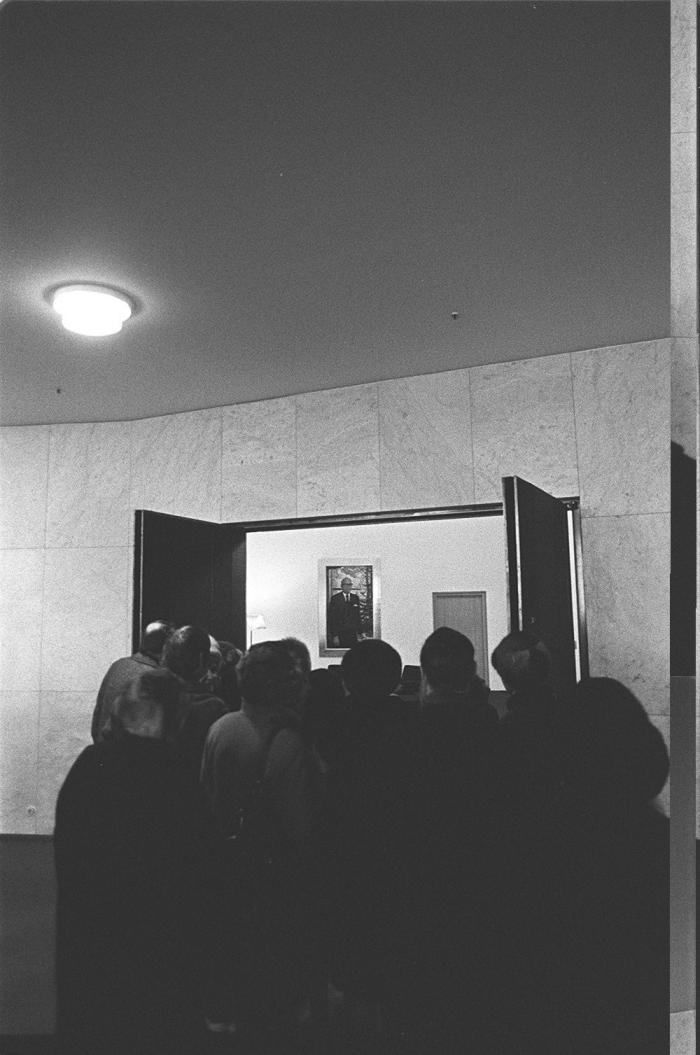 Taiteilija Ilja Glazunovin maalaus presidentti Urho Kekkosesta esillä Finlandia-talon edustuslämpiössä. Katsojat eivät pääse ovensuuta lähemmäs katsomaan taulua. Kalle Kultala, Helsinki, 1973. Suomen valokuvataiteen museo.
