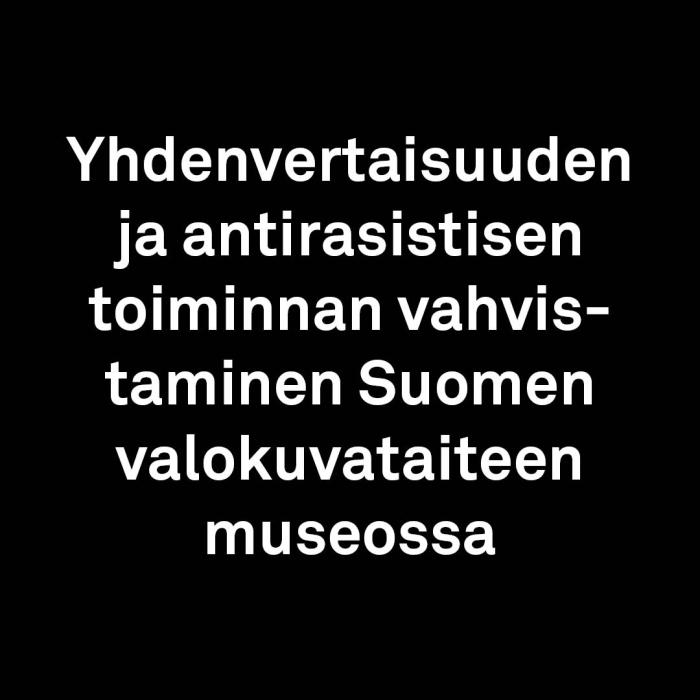 Yhdenvertaisuus on Suomen valokuvataiteen museolle tärkeä arvo. Olemme iloisia, että meidät haastetaan mukaan oppimaan uutta ja tarkastelemaan omaa toimintaamme perusteellisesti. Ei riitä, että toiminta on ei-rasistista. Epätasa-arvoisessa maailmassa tarvitaan selkeän antirasistista toimintaa. Haluamme tehdä parhaamme, jotta antirasistinen toiminta tulee pysyväksi osaksi museon toimintaa. Tiedämme, että tämä työ ei tule ikinä valmiiksi, ja siksi etsimme pitkäjänteisiä ja sitoutuneita tapoja parantaa toimintaamme.