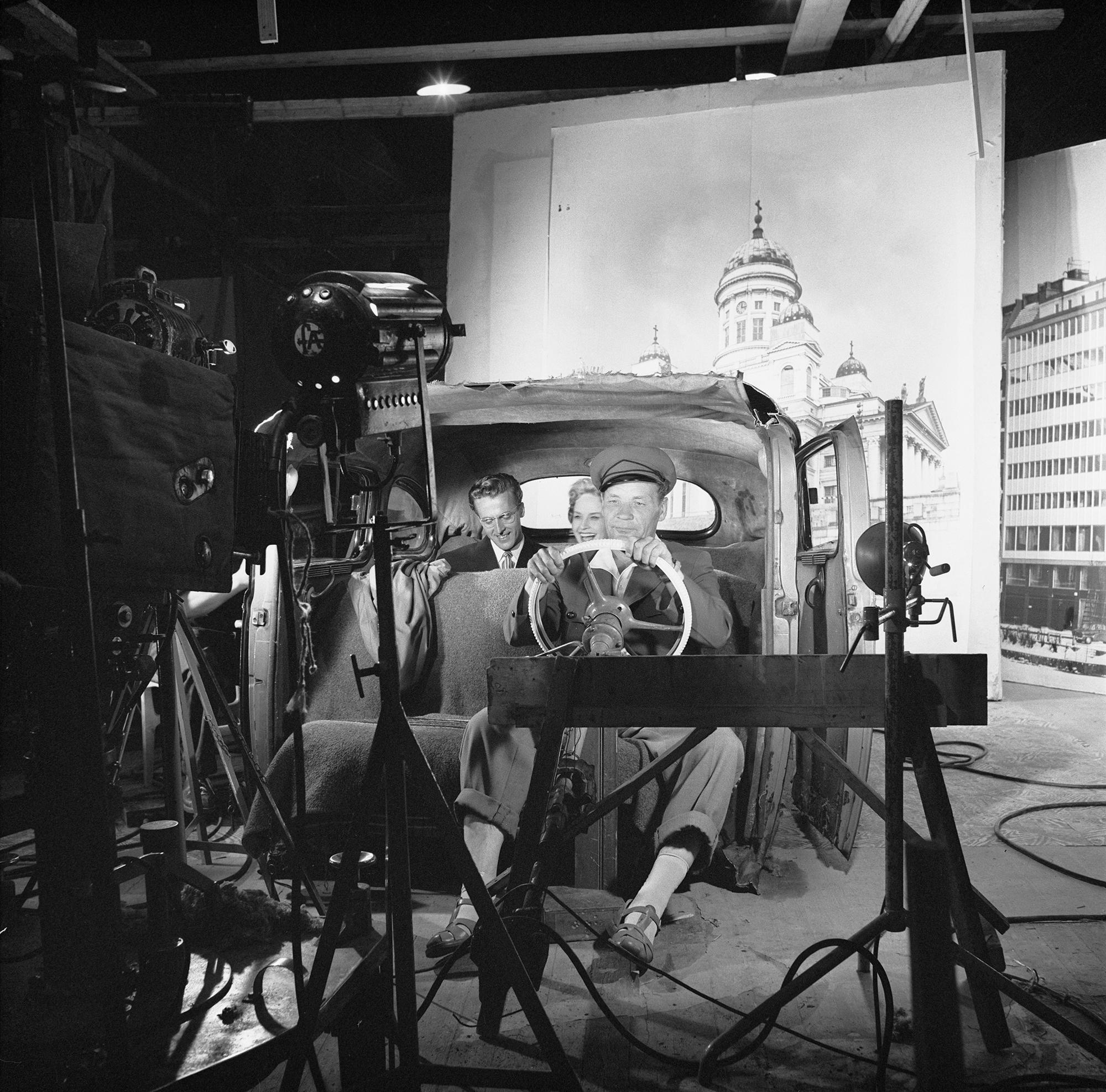 Leena Sipposen tuoma kuva: Työkuva, kohtaus Syntipukki –elokuvasta vuodelta 1957. Sampo-tavaratalon pääjohtaja (näyttelijä Rolf Labbart) ja kemikaaliosaston myyjä (näyttelijä Marjatta Kallio) ovat autonkuljettajan (näyttelijä Paavo Hukkinen) kyydissä Helsingin tuomiokirkon edustalla. Kuvassa näkyy, että kohtaus on kuvattu lavasteissa: auto on lavaste, samoin taustan maisema.